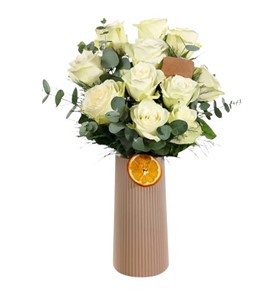 Bej Çizgili Vazoda 11 Beyaz Gül