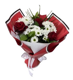 Kırmızı Kağıtta Beyaz Papatya ve Güller