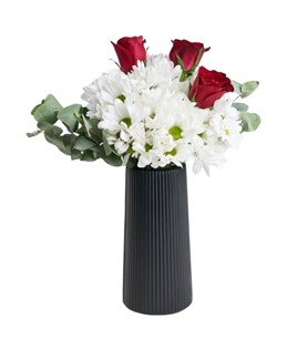 Siyah Çizgili Vazoda Beyaz Papatya ve Kırmızı Güller