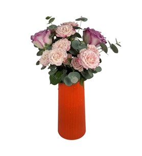 Turuncu Çizgili Vazoda Pembe Çardak ve Lila Güller