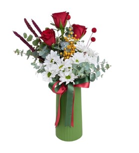 Yeşil Çizgili Vazoda Beyaz Papatya ve Kırmızı Güller